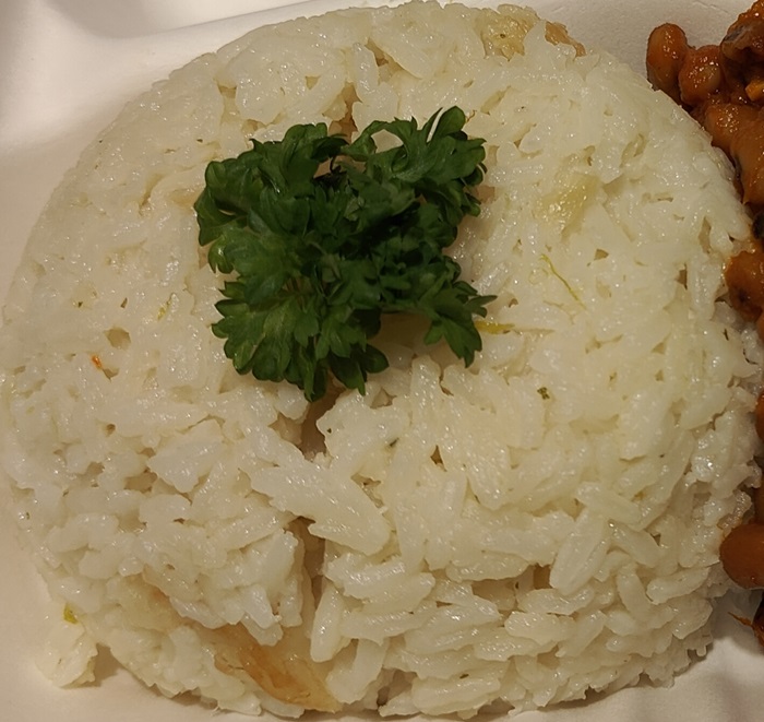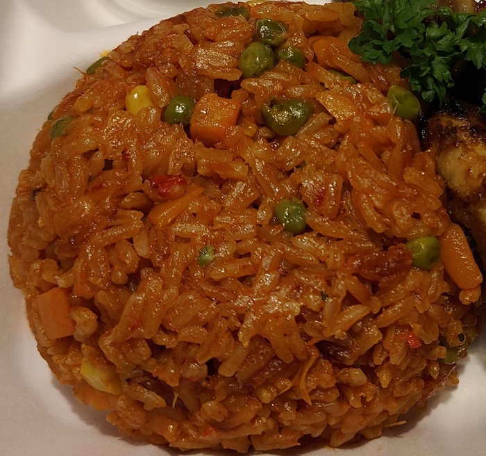 Riisi, öljy, tuore tomaatti, tomaattipyre, tuore inkivääri, sipuli, valkosipuli, tuore habanero/chili, pakastevihannes (herne-maissi-porkkana).