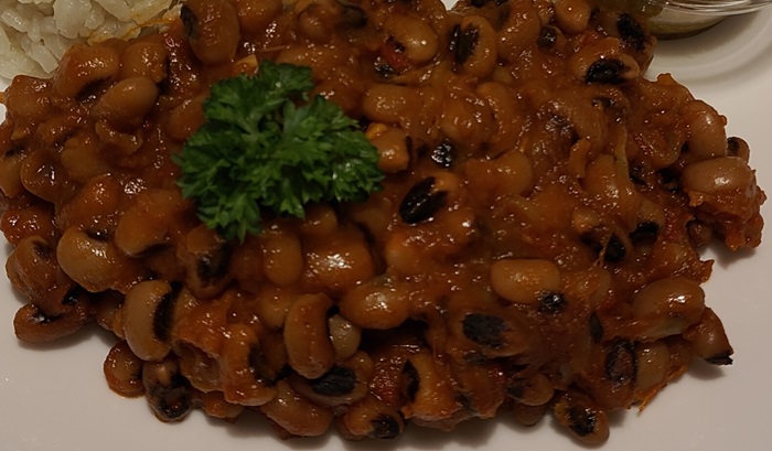Mustasilmäpapu, sipuli, tuore tomaatti, tomaattipyre, öljy, tuore habanero/chili, tuore inkivääri, valkosipuli.