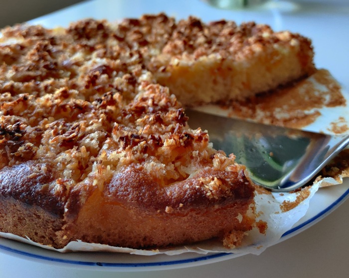 Kananmunia, hienosokeri, laktoositon kuohukermaa, laktoositon voi, vehnäjauhoa, leivinjauhetta, kookoshiutale ja säilyke mangoa.